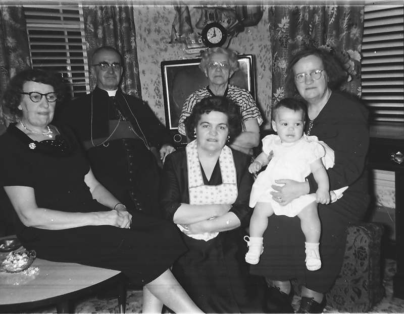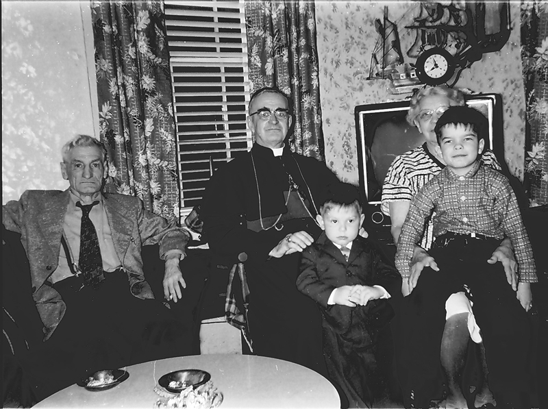 1956 - Bishop Bonhomme at 53 Tremont St with Aunt Armande, Elodia B. Gosselin, Stella G. Paquette, Stella Paquette and Emma Bonhomme