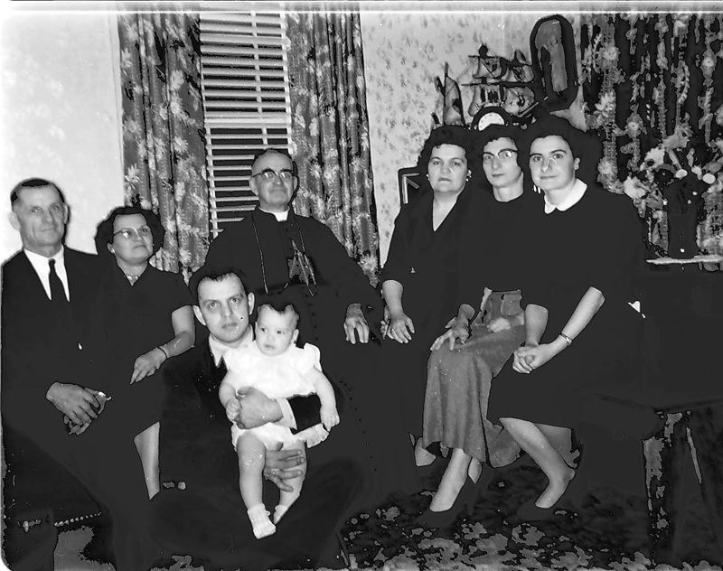 1956 - Bishop Bonhomme at 53 Tremont St with Andre Paquette, Noella and Josephat Lacasse (holding), Stella Paquette, Stella G. Paquette, Bea Small and Rowella Goeffroy