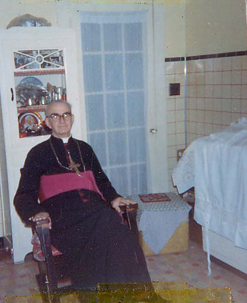 1956 - Bishop Bonhomme at 53 Tremont St with Henri Gosselin, Elodia B. Gosselin, Raymond LaCasse and Simon Paquette