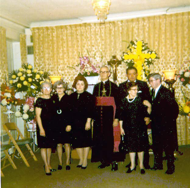 1970 - Funeral of Elodia B. Gosselin. Bella, Dora, Stella, Mgr Bonhomme, Bob, Lowella and Peter - At wake
